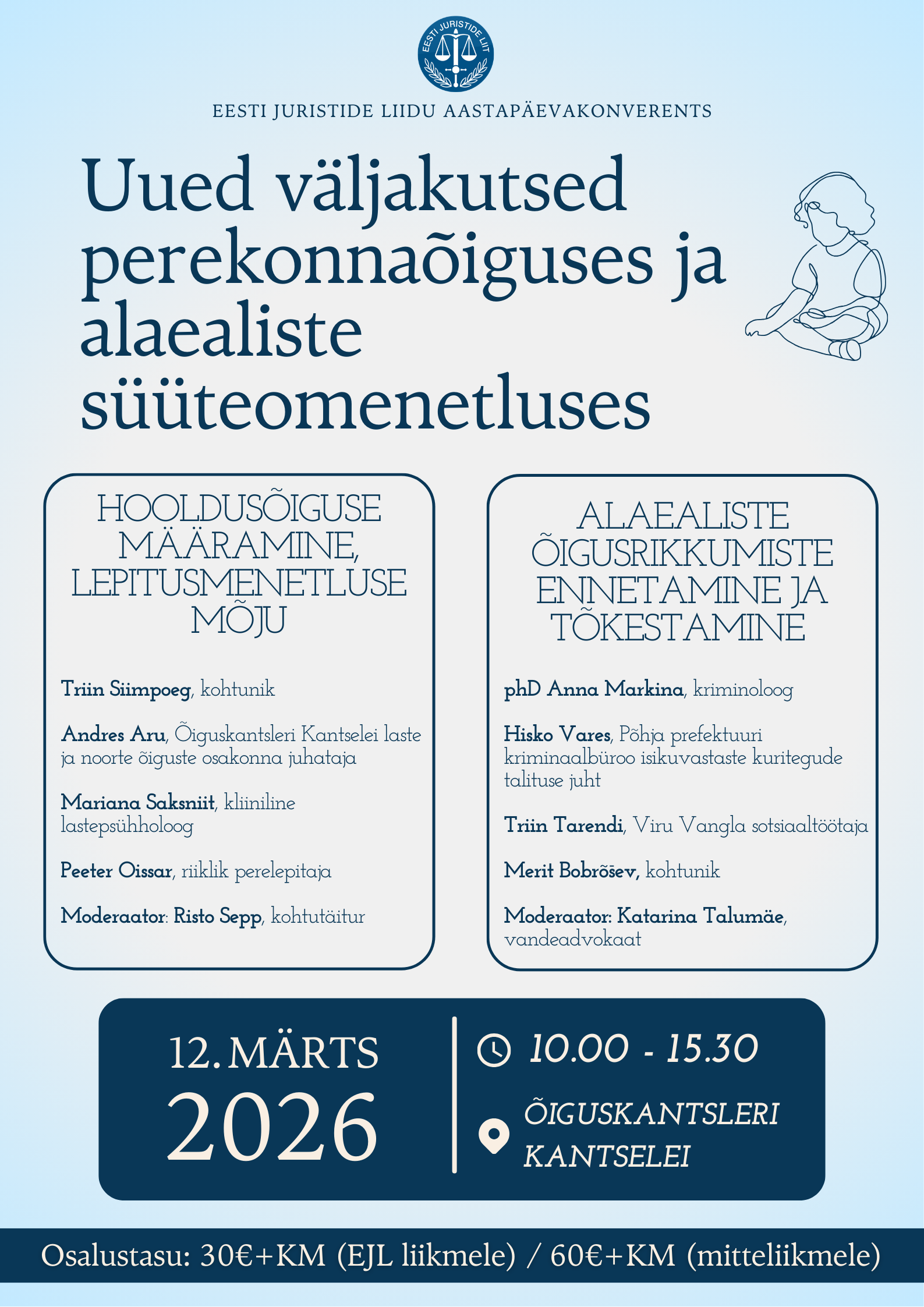 Eesti Juristide Liidu aastapäevakonverents „Uued väljakutsed perekonnaõiguses ja alaealiste süüteomenetluses” toimub 12. märtsil 2026 algusega kell 10.00 Õiguskantsleri Kantseleis.