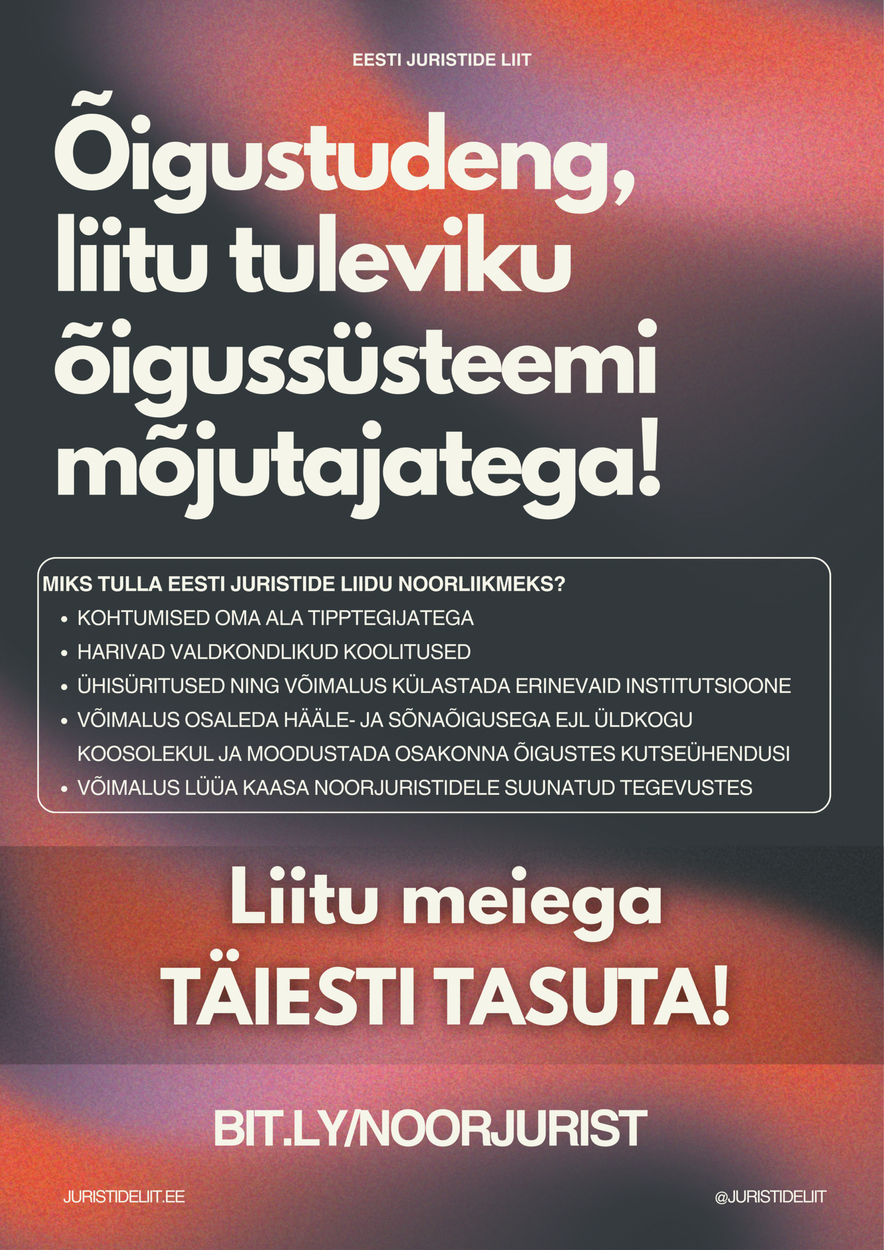 Eesti Juristide Liidu volikogu võttis 02.12.2025 toimunud istungil vastu märgilise otsuse – kaotada ära noorliikmetele sisseastumis- ja liikmemaks. See on meie jaoks väga oluline samm. Soovime, et noored juristid saaksid juba juuraõpingute ajal lüüa kaasa meie tegemistes ja olla osa juristide kogukonnast.